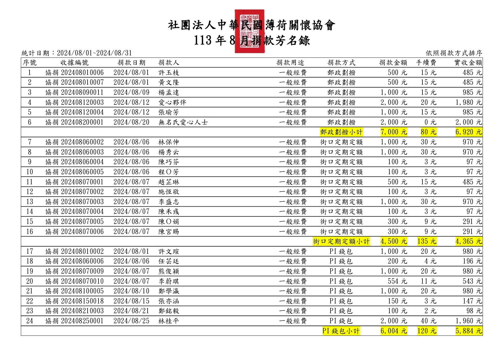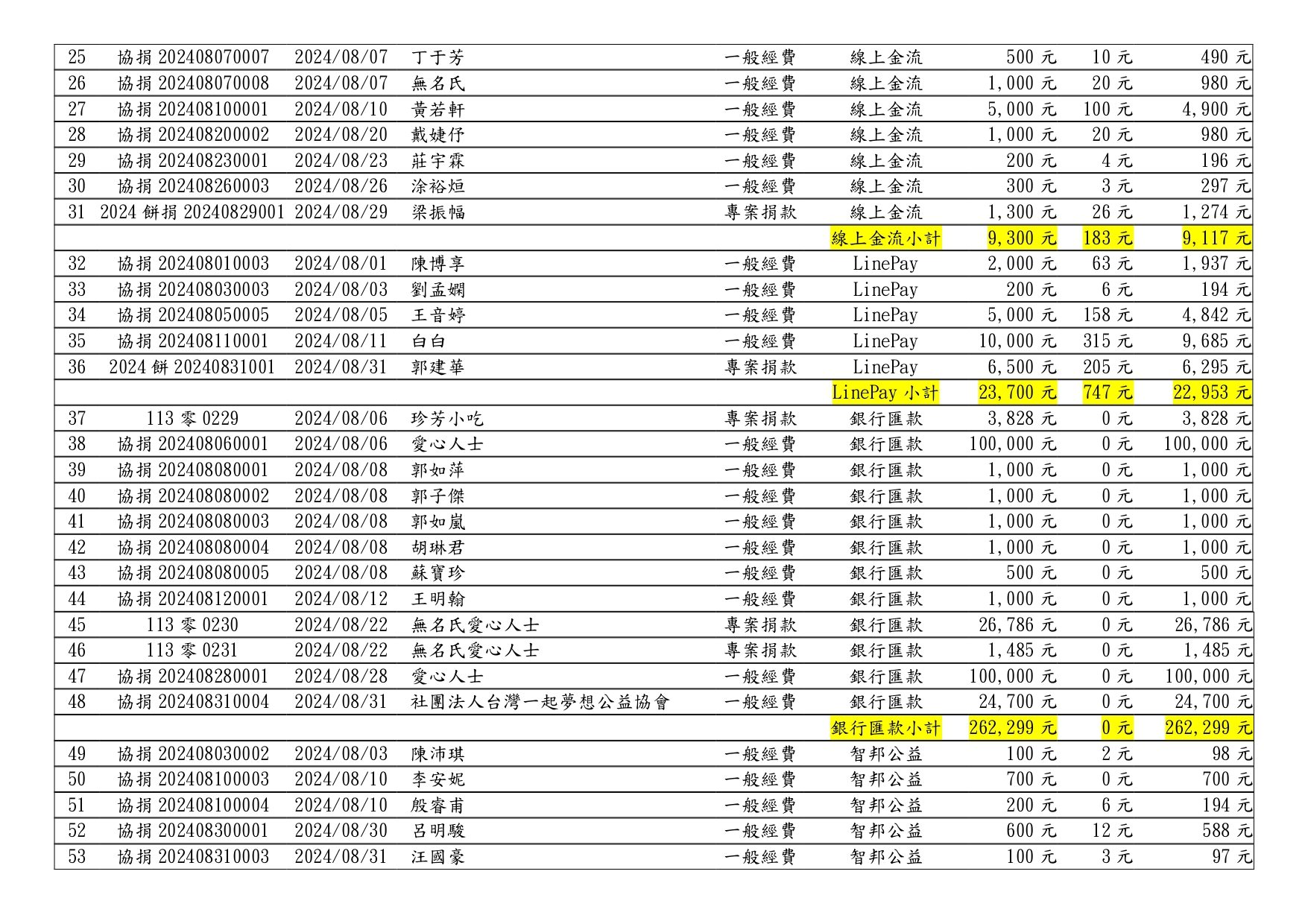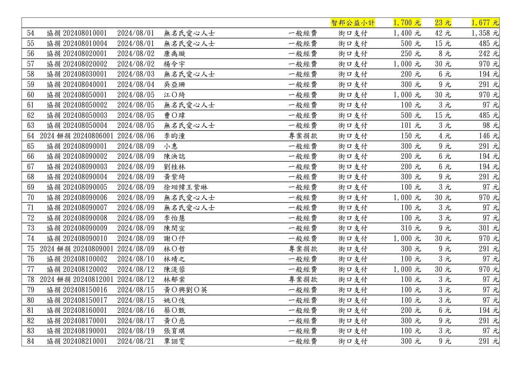 113年08月捐款芳名錄