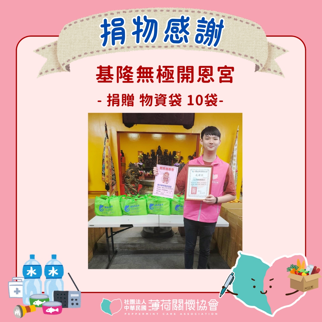 感謝基隆無極開恩宮捐贈物資袋10袋!!